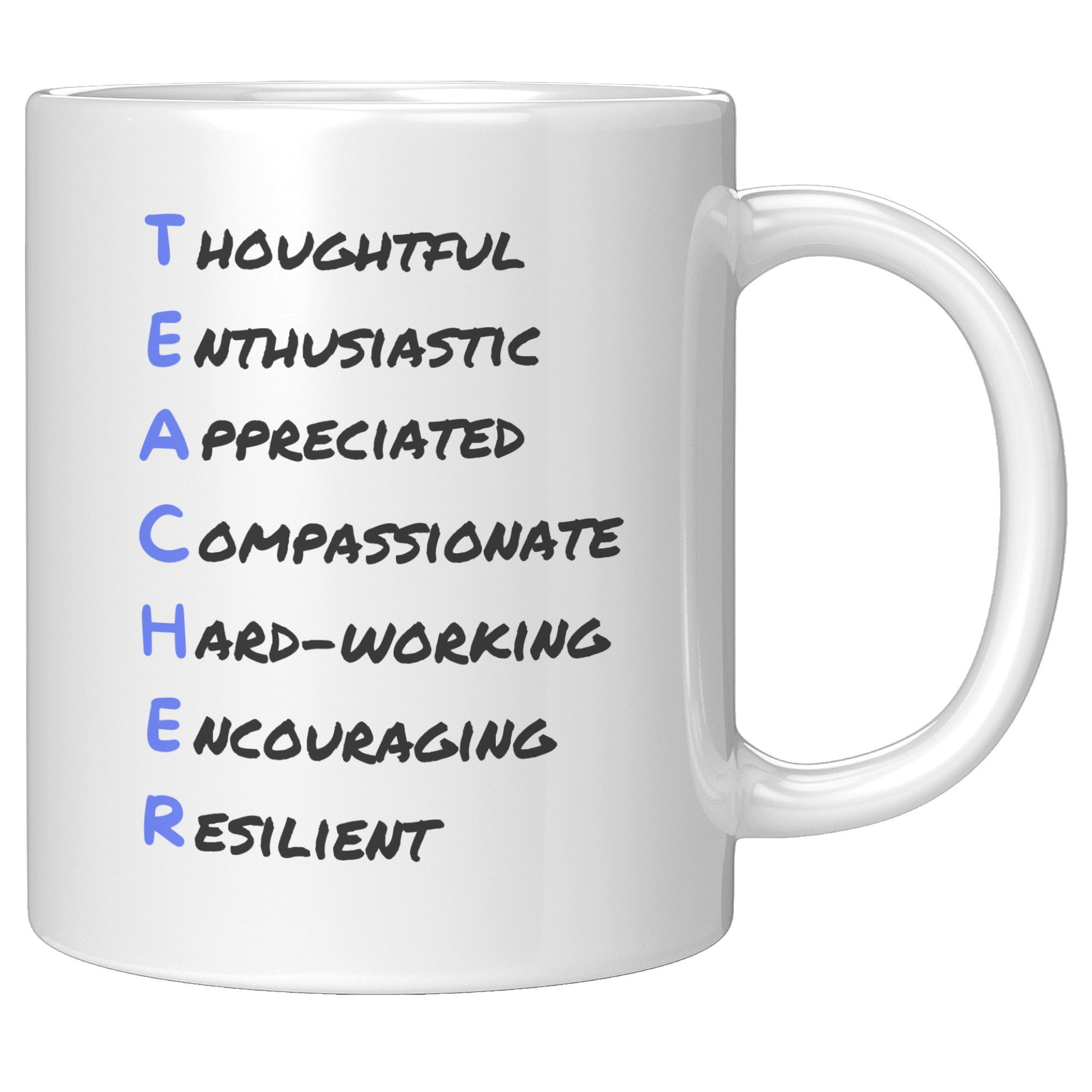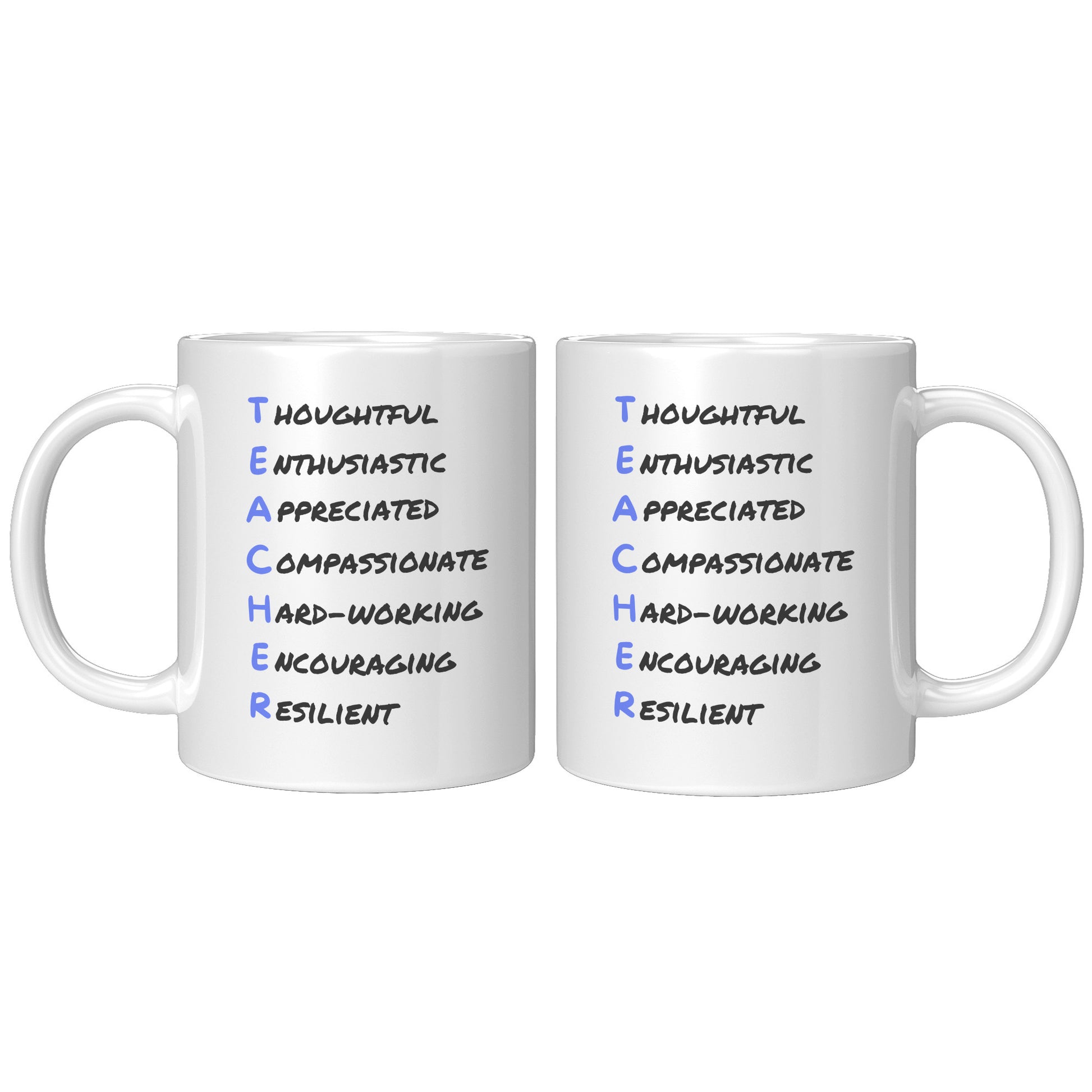 TEACHER gift mug. Thoughtful, Enthusiastic, Appriciated, Compassionate, Hard-working, Encouraging, Resilient.